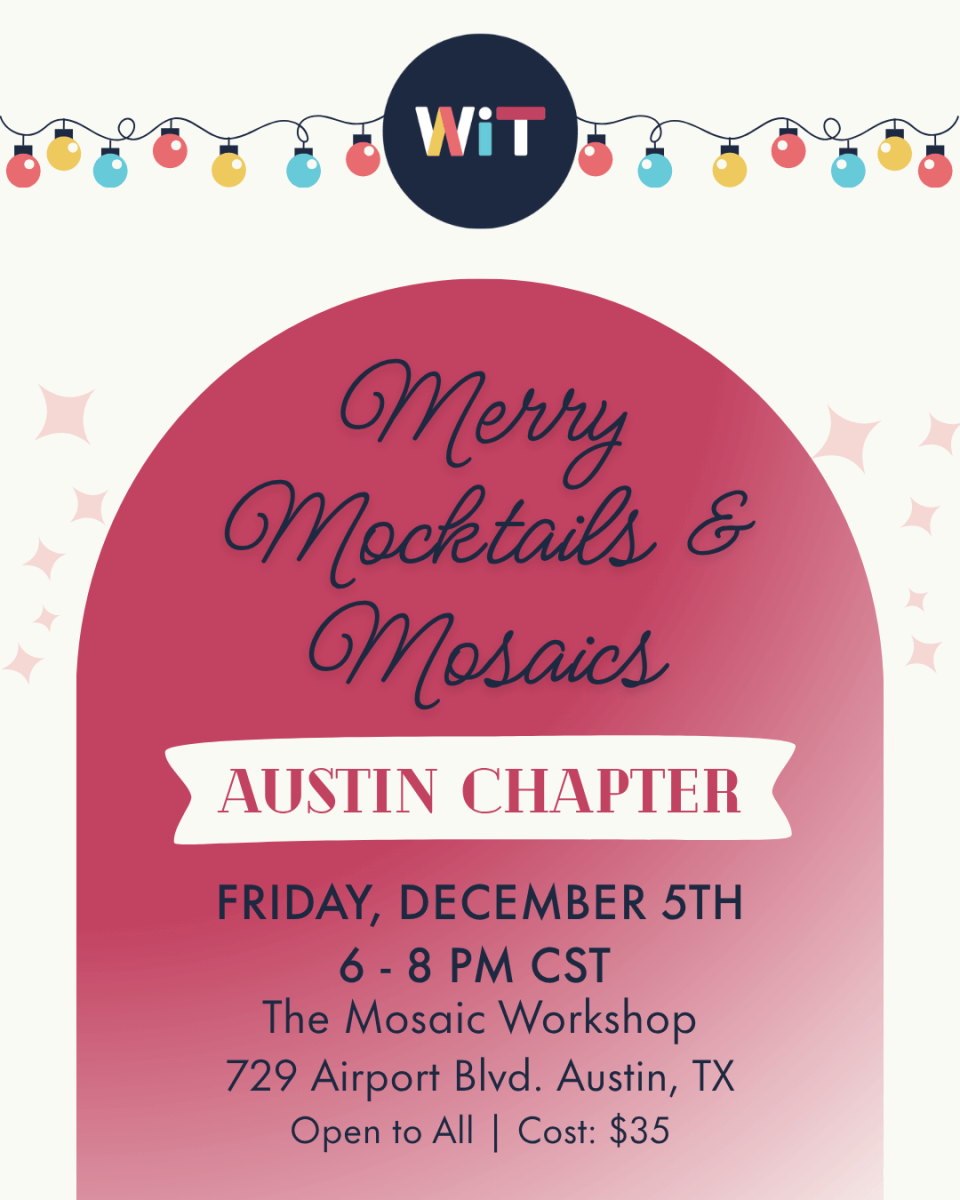 Join the WiT Austin chapter on Friday, December 5th from 6 - 8pm at The Mosaic Workshop for an evening of mingling, making, and merriment! Enjoy crafting a custom coaster using shimmering glass, handmade ceramic, recycled tiles and more while sipping mocktails from Altar Native Bar.