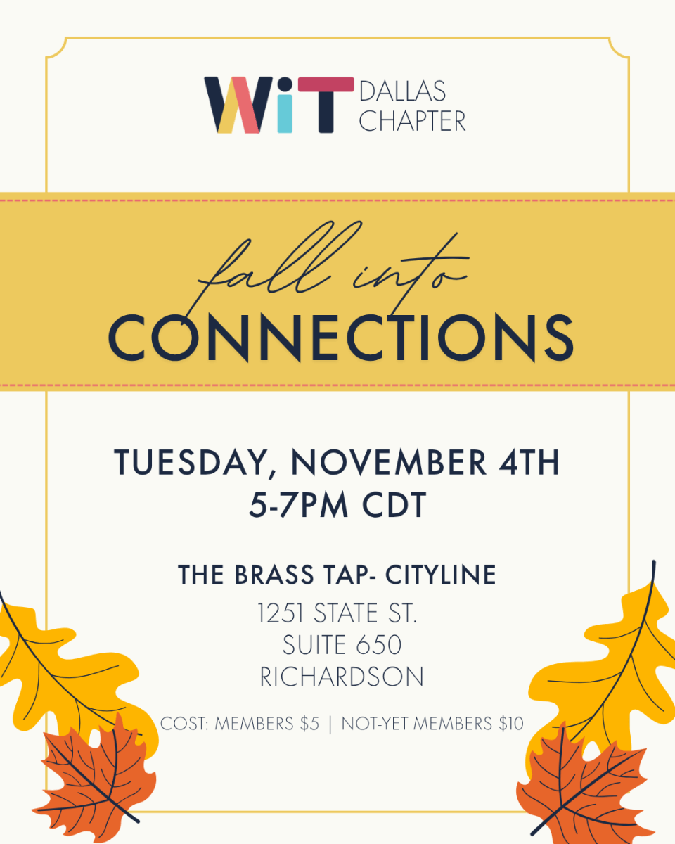 Spice up your week by joining us for a fun evening of networking with the WiT Dallas Chapter! Join us at the Brass Tap on Tuesday, November 4th from 5:00-7:00pm to meet fellow industry professionals and fall into new connections!
