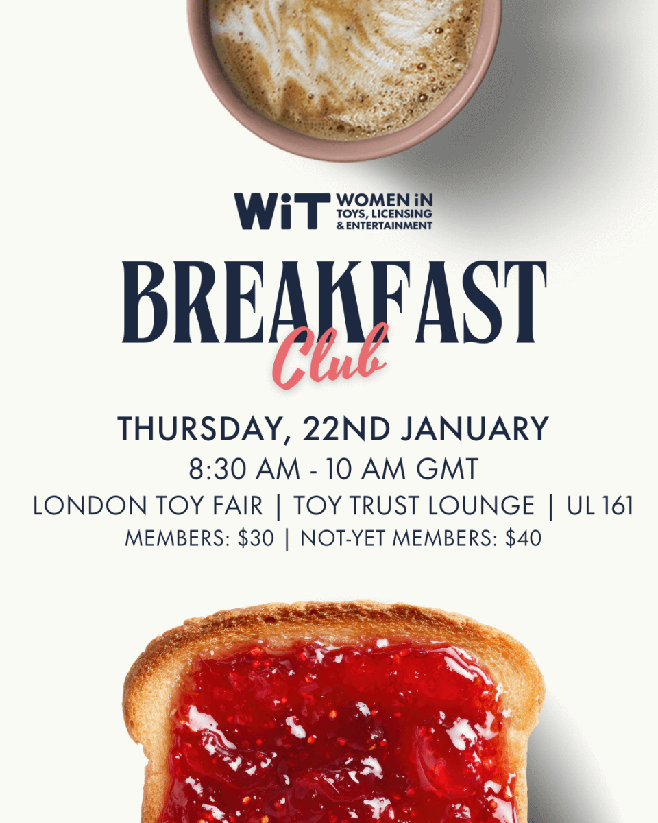 Start your day with great conversation, fresh connections and a warm WiT welcome. Join us on Thursday, January 22nd from 8:30am-10am in the Toy Trust Lounge within the London Toy Fair halls and meet industry peers, partners and professionals for a morning gathering over breakfast.