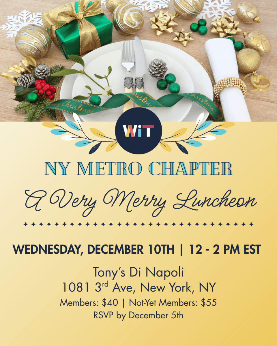 Have yourself a very merry luncheon with the NY Metro WiT Chapter on Wednesday, December 10th from 12pm-2pm! Enjoy a great meal with even lovelier company at Tony’s Di Napoli on the Upper East Side!