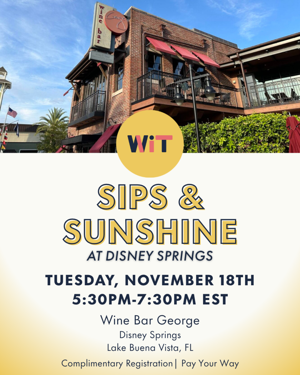 Join WiT on Tuesday, November 18 from 5:30pm to 7:30pm for Sips & Sunshine at Wine Bar George in Disney Springs!