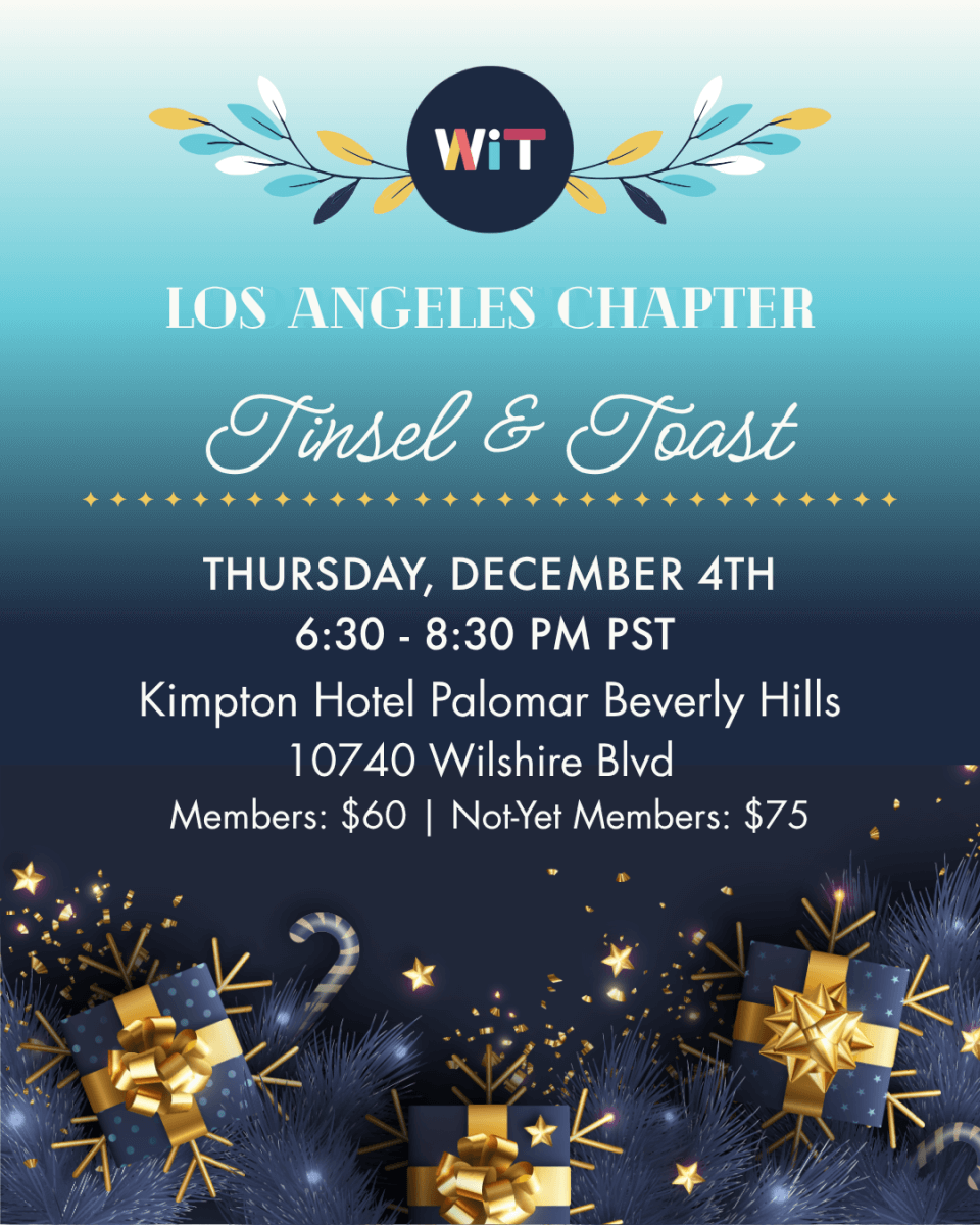 Join the WiT LA Chapter for a sparkling evening of celebration, connection and holiday cheer on Thursday, December 4th! Tinsel & Toast at the Palomar Hotel brings together our inspiring community from across our industry for one unforgettable night.