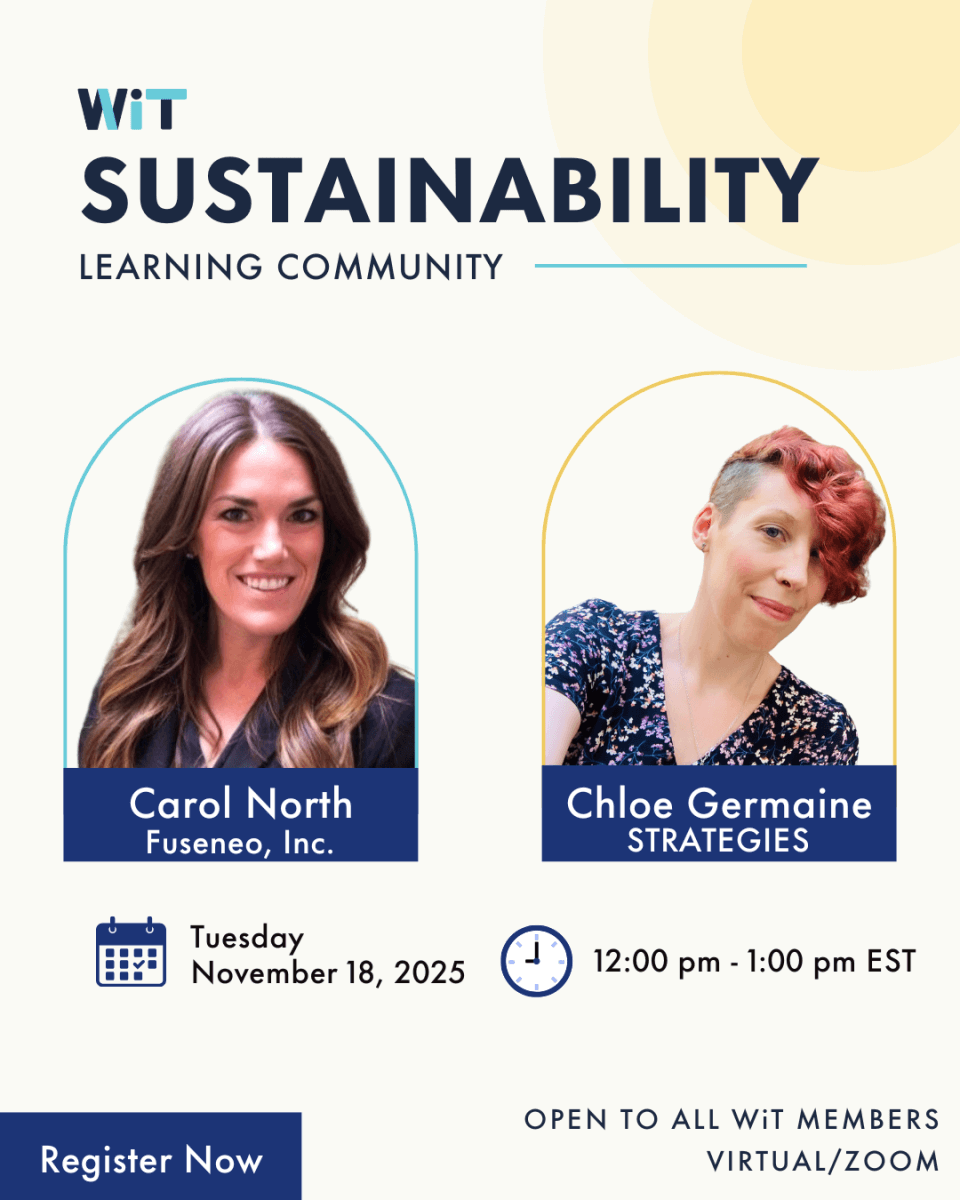 Join WiT's Sustainability Learning Community in our quarterly roundtable! Whether you are looking to learn more about sustainability in general, or want to connect with others in your specific area of expertise or interest, these quarterly gatherings are focused on what you, the community, want to learn about and discuss. For this call, the SLC will be joined by Carol North from Fuseneo, Inc. and Chloe Germaine from STRATEGIES to discuss sustainable packaging.